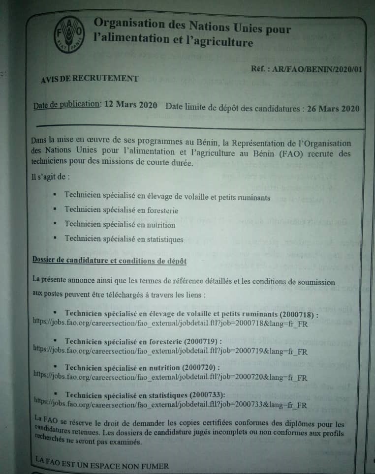FAO lance le recrutement de techniciens spécialisés dans les domaines suivants 1314 vues2 candidatures