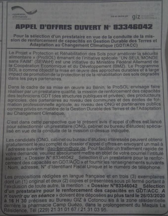 LE Projet ProSOL lance le recrutement d’un prestataire de service 1464 vues1 candidature